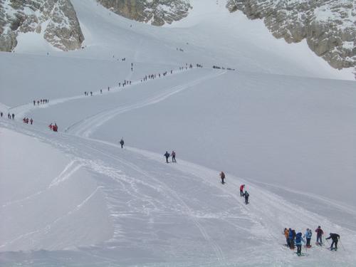 | Und auch hier bekommt man einen Eindruck vom Andrang auf den Dachsteingletscher an einem schönen Wochenendtag. Der Großteil fährt westlich vom Gjaidstein mit Touren- oder Alpinschi nach Obertraun ab. |
