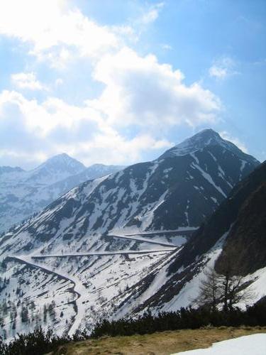 Nach dem Verzehr eines ganzen Packerls Studentenfutter (erst nachträglich habe ich festgestellt, daß ich da gerade 1.000 Kalorien verfuttert habe) - verspüre ich ungeahnte Bärenkräfte, und ich beschließe, nach der Abfahrt zur Kaltenbachalm zur verlockenden Hornfeldspitze aufzusteigen. Im Bild erkennt man gut auch jenen Teil der Sölkpaßstraße, der noch nicht geräumt ist. |