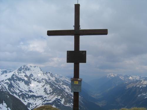 | Beim Gipfelkreuz auf der Hornfeldspitze - Blick über das Großsölktal Richtung Ennstal. Links das Deneck. |