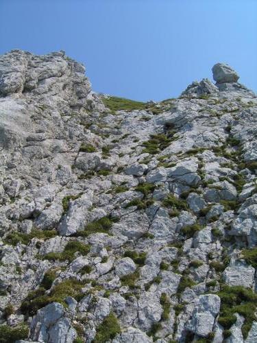 | An dieser Schlüsselstelle am Weg zum Kleinen Fritzerkogel wird es etwas anspruchsvoller. Ein etwa 10 Meter hohes fast senkrechtes, ziemlich ausgesetztes "Wandl" mit geschätzter Schwierigkeit I-II oder II ist zu erklettern ... |