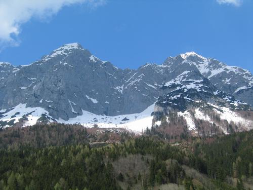 | Beim Start am Bahnübergang in Espang. Blick hinauf zum Grimmingtor ca. 900 Meter höher (der teilweise mit Schnee gefüllte Einschnitt in der Felswand, etwas links der Bildmitte). |