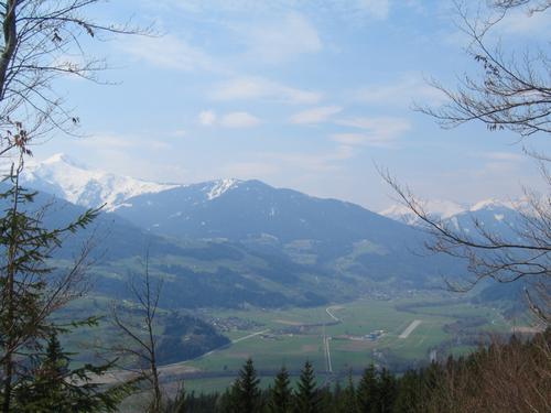 | Beim Aufstieg. Blick über das Ennstal mit der gut erkennbaren Start- / Landebahn des Flughafens in Niederöblarn. Links das noch immer reichlich schneebedeckte Gumpeneck. |