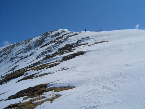 | Vom Schidepot zum Gipfelkreuz. Ein Bergfex am Kreuz hat mich gewarnt, diese Wechten zu betreten. Auch wenn man noch festen Grund unter sich hat, ist die Wechte schon keilförmig weggebrochen, so daß man unweigerlich mit in die Tiefe gerissen wird. Einige Wanderer ignorieren lächelnd seine Hinweise, einige Tourengeher fahren überhaupt mit den Schiern knapp am Rand ab. |