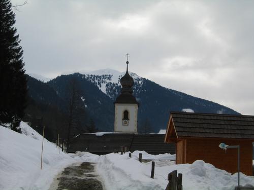 | Start bei der Kirche in Oppenberg. 4 Schitourengeher brachen kurz vor mir auf. Obwohl ich auch die Tourenschi im Auto hatte, entschied ich mich wegen der Wetter- und Schneeverhältnisse (leichtes Nieseln, Faulschnee) doch für die Schneeschuhe. |