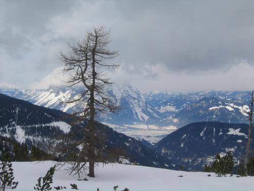 Beim Aufstieg - an einer Waldlichtung. Blick nach Nordwesten ins Ennstal. Dahinter ragt der Grimming empor.