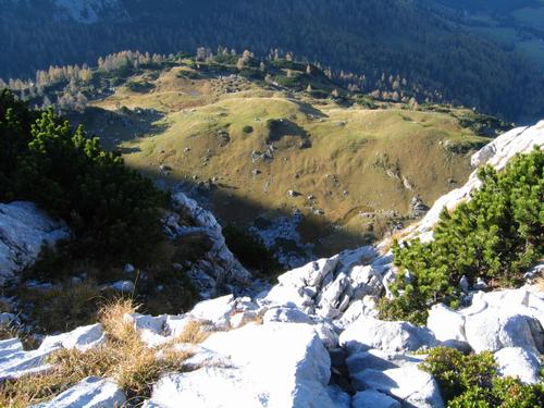 | Aus der Scharte erreicht man in wenigen Minuten einen links (westlich) der Scharte liegenden Hügel, von dem man beste Ausblicke auf das mehr als 400 Höhenmeter tiefer gelegene Rinderfeld genießen kann. |
