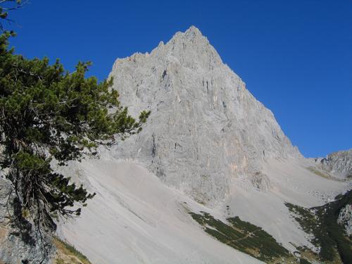 Blick zurück zum Torstein, der in früheren Zeiten als höchster Gipfel des Dachsteingebirges gegolten hat, tatsächlich aber mit seinen 2.948 Metern um 47 Meter niedriger als der Hohe Dachstein ist. Rechts erkennt man in den Latschenfeldern den Pernerweg, der in das Kar nach rechts hinauf und durch das "Tor" zur Dachsteinsüdwandhütte führt. |