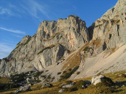 | Und noch einmal die Reißgangscharte. Man erkennt hier sehr gut den steilen Aufsteigsweg am Wandfuß von links unten nach rechts oben, und schließlich im Schatten (heute morgen sehr windig) zum höchsten Punkt aufwärts. |