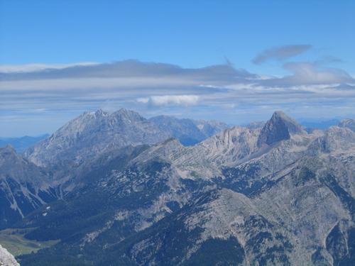 Der ferne Ausblick vom Birnhorn ist ebenso wie die nähere Felsszenerie großartig und grandios. Links im Hintergrund erkennt man den Watzmann, dessen Überschreitung ich noch im heuigen Jahr geplant hätte. Rechts der markante Große Hundstod. |