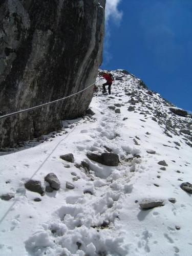 Vom Abstieg über die Nordseite wird bei Schnee zwar abgeraten, der Weg über die Kuchlnieder erschien uns beiden aber - vor allem auch wegen der fast klettersteigmäßig ausgebauten Sicherungen trotz einiger heikler vereister Stellen erheblich einfacher und ungefährlicher, als der Rückweg über die Südwand. |