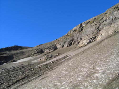 | ... an einer Stelle ist ein steiles und ziemlich hartes Schneefeld zu queren. Lediglich die Erde und einige Steine am Schnee sorgen dafür, daß man ohne Steigeisen den Halt nicht verliert - zumindest heute aber wäre diese Hürde einfach einige Höhenmeter weiter unten zu umgehen gewesen. |