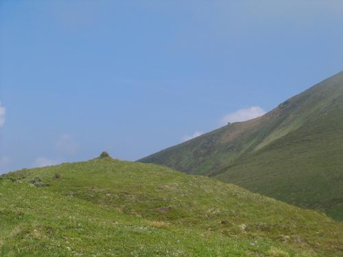 | In direkter Begegnung treffe ich heute nur 2 Wanderer - hin und wieder kann ich in der Ferne weitere Zweibeiner erkennen - so wie hier am Westrücken der Breiteckkoppe (ganz hinten, ganz winzig) - aber auch der Hügel links im Vordergrund hat durchaus etwas Menschliches an sich. |