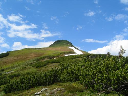 | ... und über die Karlscharte der - von hier gar nicht mehr so spitz aussehenden - schafbewanderten (oberhalb des Schneefeldes) Schoberspitze zustrebend. |