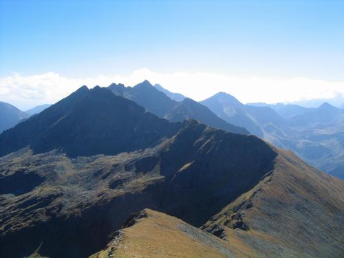 Beim Austieg - kurz vorm Gipfel. Blick nach Süden: Der Kammverlauf über Ghagspitz, Seekarspitze bis zum Predigtstuhl