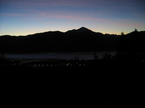 Start in der Dunkelheit oberhalb von Gröbming / Hofmanning. Aufstieg mit der Stirnlampe entlang des steilen, aber unschwierigen Ziehweges bis zum Säbelboden. Am darüberliegenden Schlag mit guter Aussicht warte ich auf den anbrechenden Tag. Die Umrisse des Gumpenecks heben sich vom Himmel ab. Unter mir leuchten die Straßenlaternen am Mitterberg. |