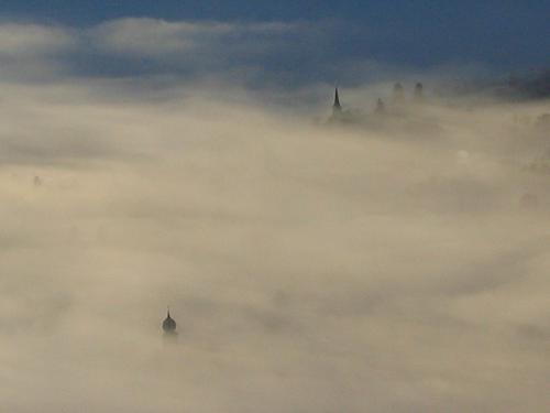 Vorne links unten der Zwiebelturm der katholischen Kirche und oben rechts die Kirchturmspitze der evangelischen Kirche