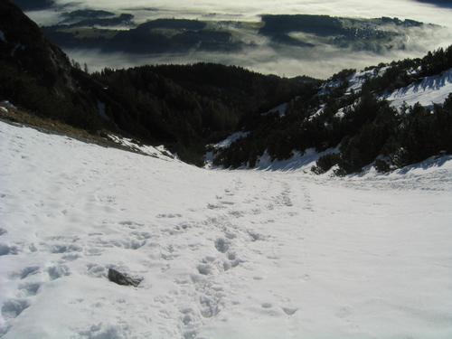 Bei Schnee kann man den Sommerweg über die schneebedeckten Schotterfelder gut abkürzen