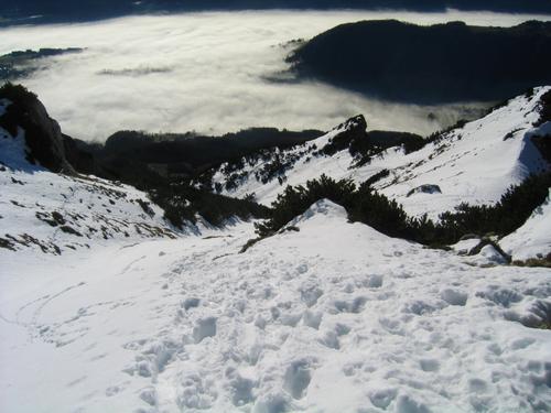 Tiefblick über die Aufstiegsroute und das noch immer nebelverhangene Gröbming