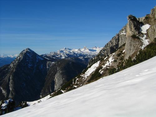 Ausblick nach Westen über den Stoderzinken (links) hinweg auf die Dachsteingipfel.