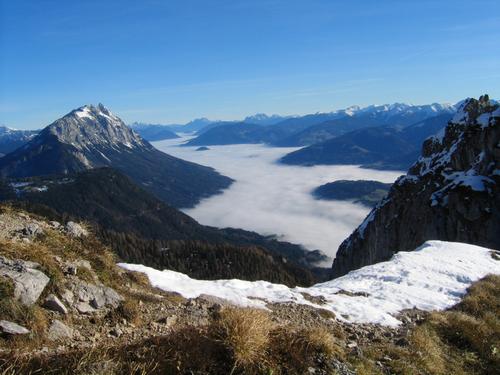Blick nach Osten mit dem Grimming (links) über dem nebeligen Ennstal
