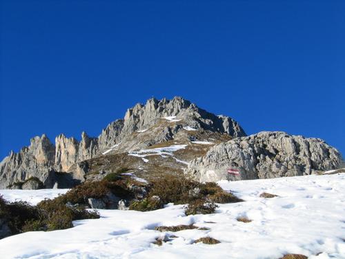 Beim "großen Stein" wieder einmal ein Blick hinauf zum Gipfel. Das Edelweiß am Gipfelkreuz ist als weißer Punkt über den höchsten Felsen erkennbar.