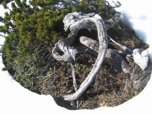 Der Schnee bildet einen natürlichen Bilderrahmen um ausapernde Latschen und Wurzeln
