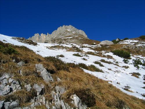 | Im Vergleich zu meinem Besuch vor einer Woche am 26.11.2006 gab es heute deutlich weniger Schnee. Und der wenige vorhandene Schnee war - zumindest beim Aufstieg - hart gefroren, so daß man ohne nennenswertes Einsinken und fast trockenen Fußes den Gipfel ansteuerte. |