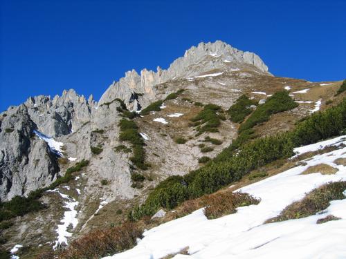 | Noch sind es ca. 300 Höhenmeter bis zum Gipfelkreuz, bei dem wir immer wieder einige Wanderer erkannten. Beim Abstieg kamen uns 4 Wanderer entgegen, beim Gipfel selbst kamen 2 Wanderer nach, und beim Abstieg stiegen noch 3 weitere Wanderer auf. |