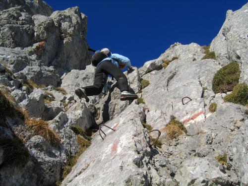 In angenehmer Turnerei geht es über die hilfreichen Trittbügel die Felswand hinauf.