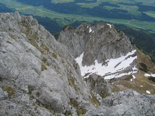 Beim Kletterausstieg kurz vorm Gipfelkreuz - Blick hinunter zum Winterstein und ins noch immer schneebedeckte Karl. Am Grat entlang erkennt man die Wegspuren herauf zum Gipfel.