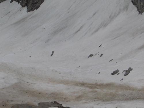 Tiefblick ins Karl, in dem einige frische Schispuren zu erkennen sind.