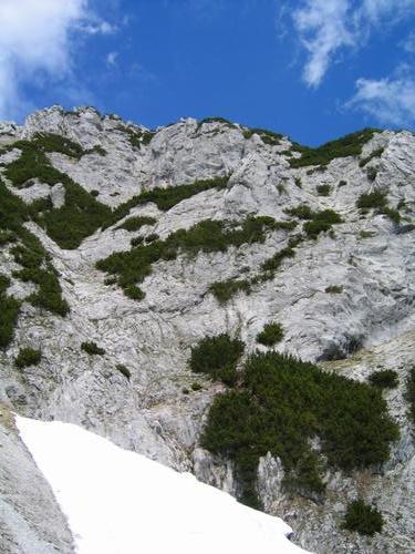 Vorbei an den felsigen Aufschwüngen auf den Winterstein - Schneefelder, wie im Bild, sind aber schon sehr rar auf der Südseite ...
