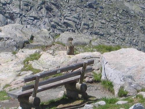 | Am Rückweg zur Kürsingerhütte begegnet man einigen Murmeltieren, die hier gar nicht so angespannt und aufgeregt sind, wie jene vor ca. 2 Wochen in der Kreuzeckgruppe. Im Bild erkennt man auch das Kürsingerhütten-Bankerl mit seinem phänomenalen Ausblick ... |
