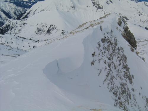 In der Scharte vor dem steilen Gipfelaufbau. Die überwechteten Wände fallen steil nach Osten ab.