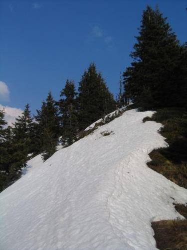 | Bis ca. 100 Höhenmeter unterhalb des Gipfels kann man schon problemlos mit festen Bergschuhen gehen. Danach aber sank ich stellenweise bis über die Knie im sulzigen Schnee ein, weshalb ich die Schneeschuhe anzog. |