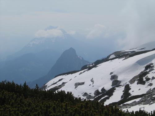 | ... und nach Westen Richtung Grimming (im Hintergrund). Vorne der Hochtausing, den man mit Hilfe eines zwar ausgesetzten, aber nicht allzu schwierigen Klettersteiges überschreiten kann. |