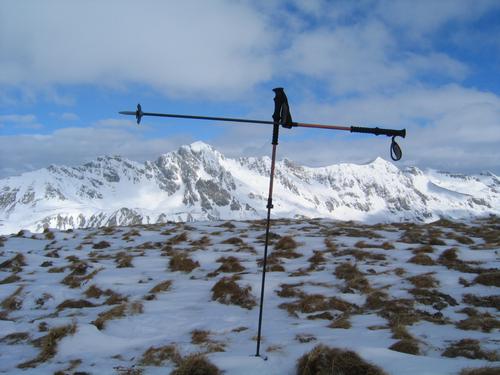 | Am abgeblasenen Gipfelplateau mit dem selbst errichteten "Gipfelkreuz". Im Hintergrund die Bergwelt südwestlich von Obertauern. |