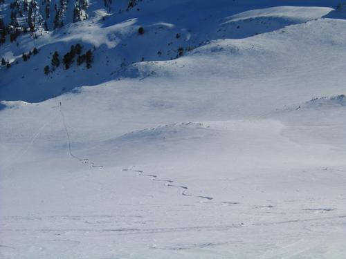 Als wir kurz vor dem Gipfel stehen, kommt uns ein einsamer Tourengeher entgegen und wedelt nach kurzem Wortgeplänkel von dannen. |