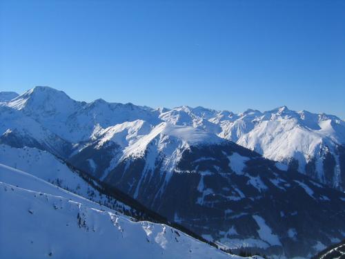 | Blick von den Wölzer in die Schladminger Tauern (die Grenze stellt das Großsölktal dar). Links der mächtige Klotz des Großen Knallstein. Der höchste Gipfel dieses Gebietes - die Hochwildstelle (ziemlich rechts) - kann aus dieser Perspektive ihre Mächtigkeit kaum präsentieren. In Bildmitte im Vordergrund liegt die Moditzen - ein schöner Schneeschuhberg. |