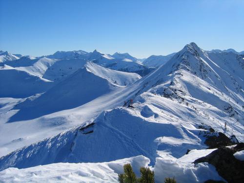 Blick vom Gipfel zu unserem Schidepot (oberhalb der Spur im Schatten). Südlich - auf der rechten Bildseite - liegt der etwas höhere Pleßnitzenkopf, von dem sich der Grat weiter bis zum Gaßeneck zieht. |