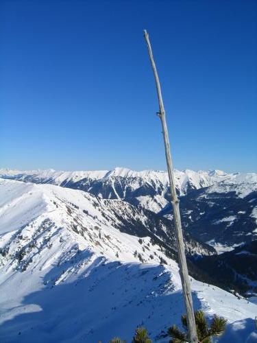 Bei der Gipfelstange. Tiefblick zum Lämmertörl, über welches man von Öblarn aus ins Donnersbacher Gebiet wandern kann. |