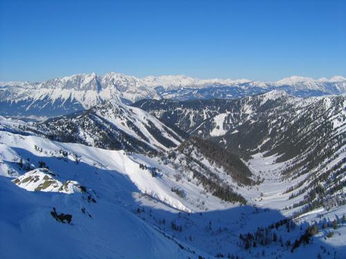 | Tiefblick ins Ramertal. Links des bewaldeten Hügels liegt das Englitztal. Links im Hintergrund thront der Grimming über dem Ennstal. |