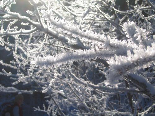 Rauhreif-Impressionen 2: Ingrid (links unten) bewundert den herrlichen Rauhreif.