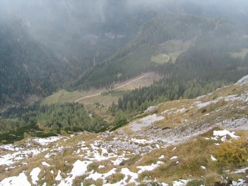 | ... weiter unten über rutschige Wiesenhänge. Das Lugauer-Massiv wird in weiterer Folge an seiner Nordostseite unterhalb des Felsfußes umschritten. Weiter unten geht es dann im Wald weiter, wo dann (teilweiser starker) Regen einsetzte. Durchnäßt komme ich schließlich in Vorderradmer an ... |