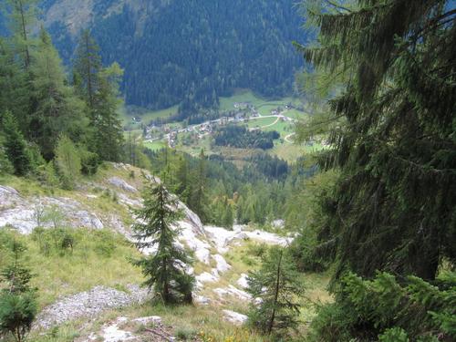 | Im untersten Teilstück führt der Weg steil und teilweise rutschig durch den Wald hinauf. Immer wieder erhascht man gute Tiefblicke hinunter ins Tal. |