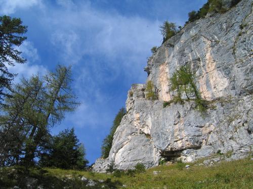 | In der Nähe des Gsptitzten Stein führt der Steig auf einem schmalen Wiesenband durch eine etwas ausgesetzte Felswand ... |