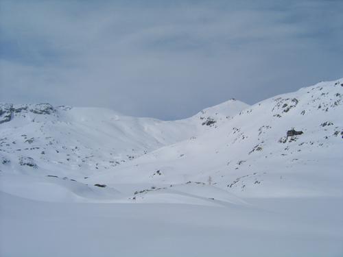 | Blick von der Giglachalm hinauf zur Ignaz-Mattis-Hütte (rechts). Links im Hintergrund die Lungauer - rechts hinten die Steirische Kalkspitze. |