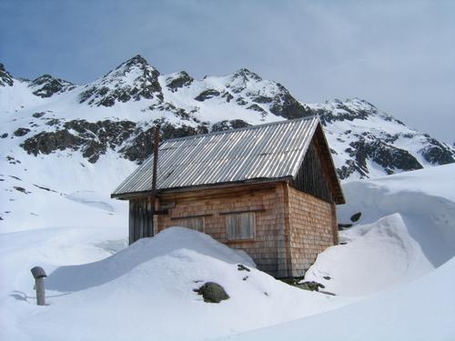 | Die zugehörige Hütte zum glänzenden Dach - im Hintergrund die Murspitzen, Giglachalmspitze und Grobfeldspitze. |