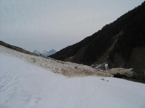 | Fast zurück beim Ausgangspunkt. Durch den sulzigen Faulschnee war der untere flache Bereich ziemlich anstrengend. Und auch heuer wieder - wie im Vorjahr - eine große Grundlawine nahe des Mauthäuschens. |