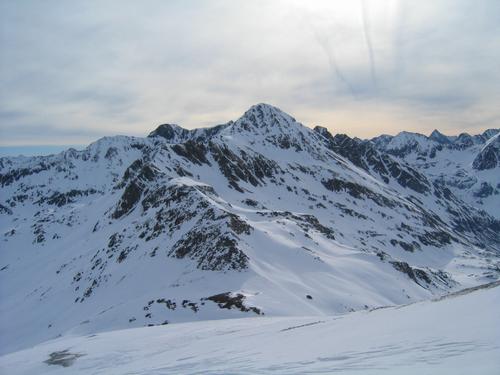 Blick oberhalb des Znachsattels nach Osten zu den Gipfeln von der Znachspitze (vorne) bis zur herausragenden Engelkarspitze. |